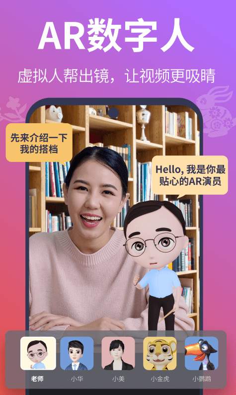 2、【AR演员】内置丰富3D虚拟演员,可以和主播同框一唱一和,也可独立表演,无需后期即可拍出趣味情景剧。