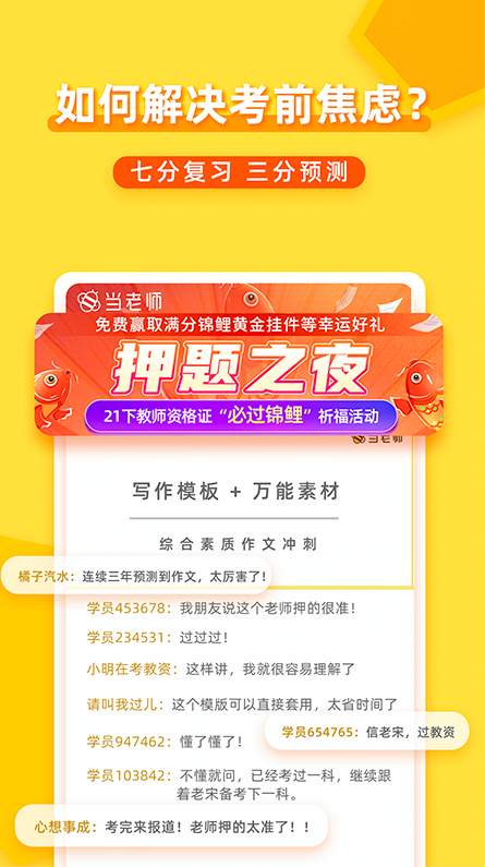 3、解决考前焦虑问题,10年行业经验,一线老师共创,本年度考试预测押题之夜,在考场有备而来;