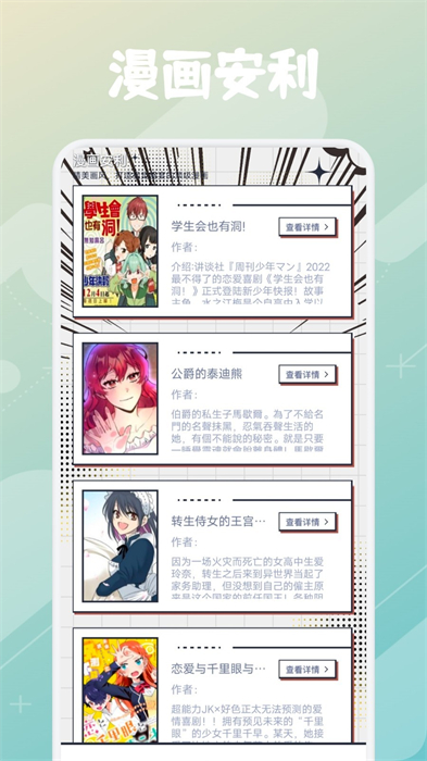 2、有很多漫画可以直接免费了解,随时查看自己喜欢的作品,非常的广泛。