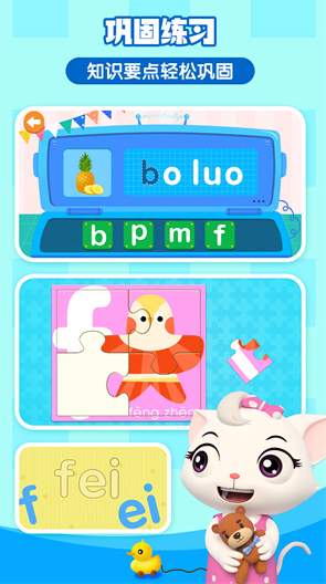 有别于传统的拼音教学,我们将课程和互动游戏巧妙地结合起来,让孩子在玩耍的过程中,不知不觉完成拼音启蒙。