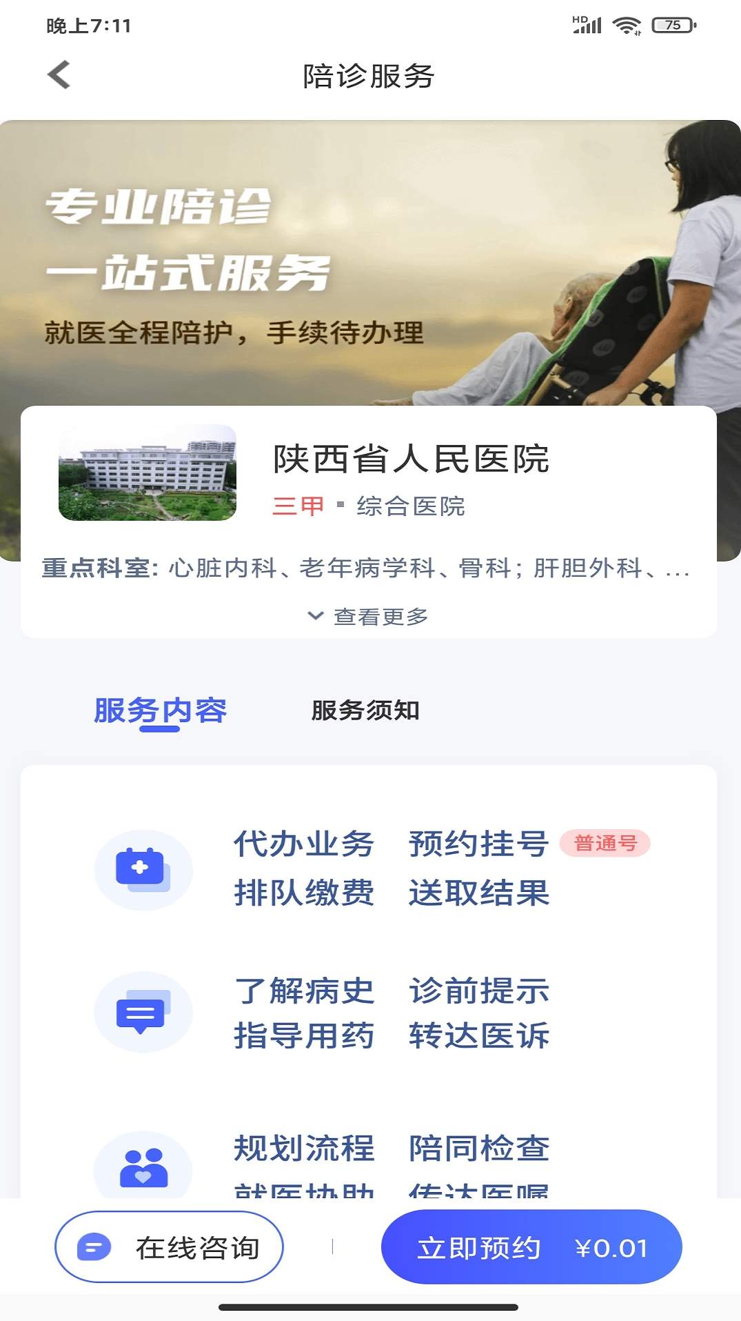 1、专业陪诊,一站式服务,三甲医院,专业陪护,就医全程陪护,待办业务,诊前陪护,院内陪诊,诊后关爱。